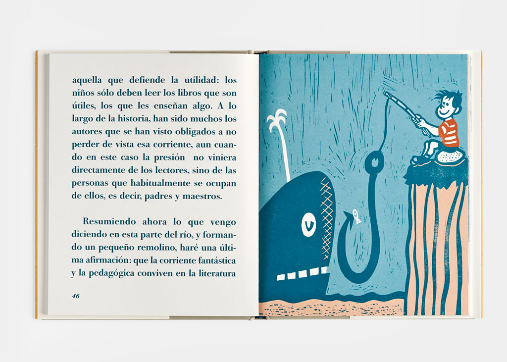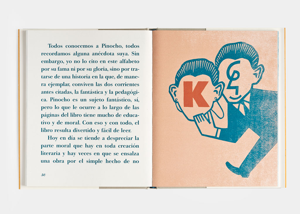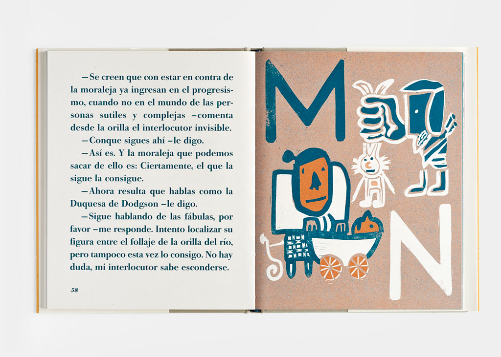 La ilustradora Alejandra Hidalgo, admiradora de la curiosa Alicia de Lewis Carroll y de la descarada Zazie de Raymond Queneau, se ha divertido lo suyo dibujando cada una de las letras y convirtiendo en una doble nariz la G de los hermanos Grimm, la F de Fábula en una vaca a medio devorar, y la J de Jaimito en un anzuelo eficaz para mobydicks.