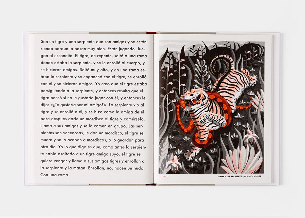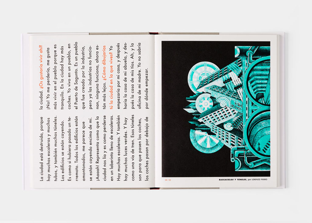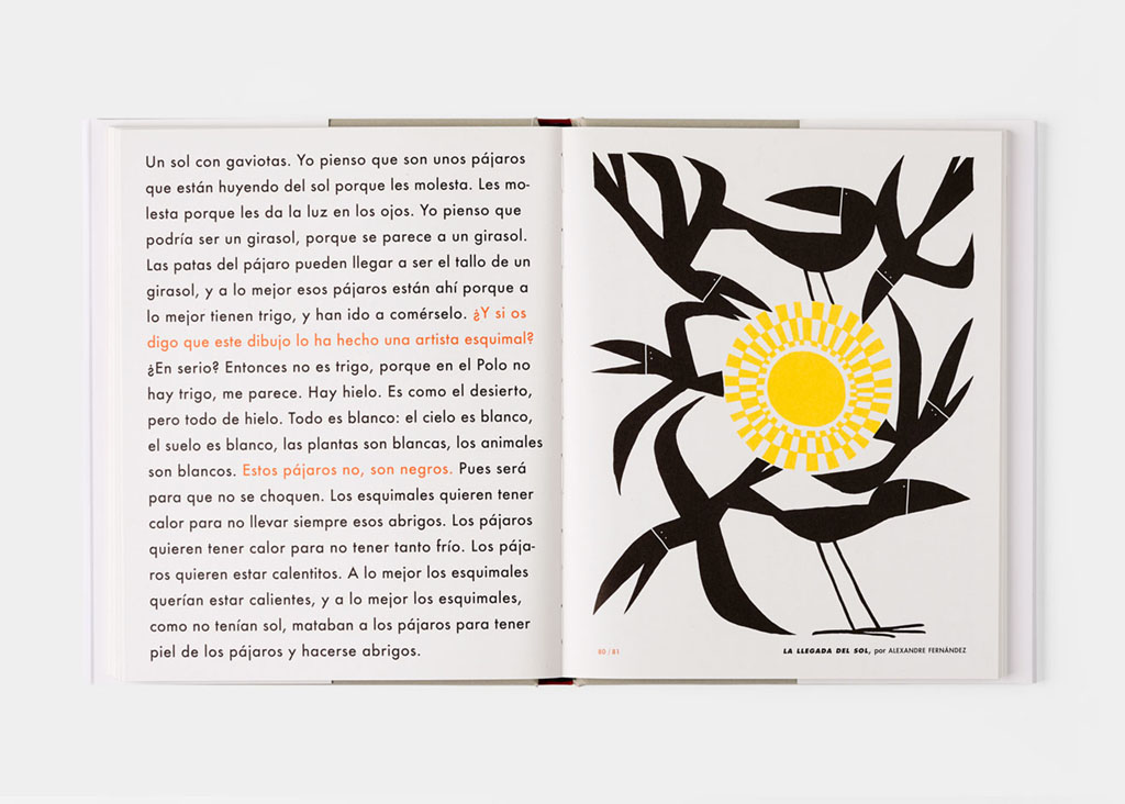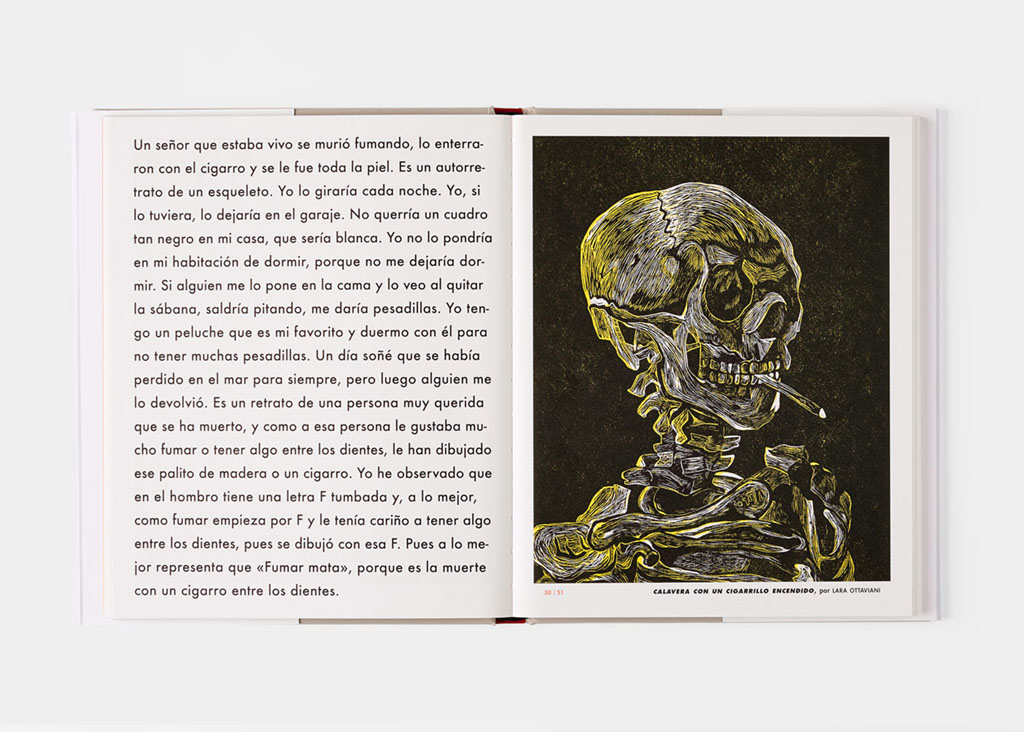 En esta obra colectiva participan treinta y un ilustradores; se trata, en su mayoría, de jóvenes profesionales al comienzo de sus carreras. A cada uno de ellos se le pidió que seleccionara dos obras de cualquier artista y período, aquellas que considerara sus favoritas, y que hiciera una versión personal usando solo dos colores. Más tarde, mostramos estas nuevas imágenes a un grupo de niños de entre 6 y 12 años, y, como fue una experiencia interesante, decidimos incluir sus opiniones y comentarios.